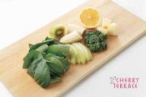 - 葉野菜は1〜2cm幅に切り、果物は2〜3cm角に切る。