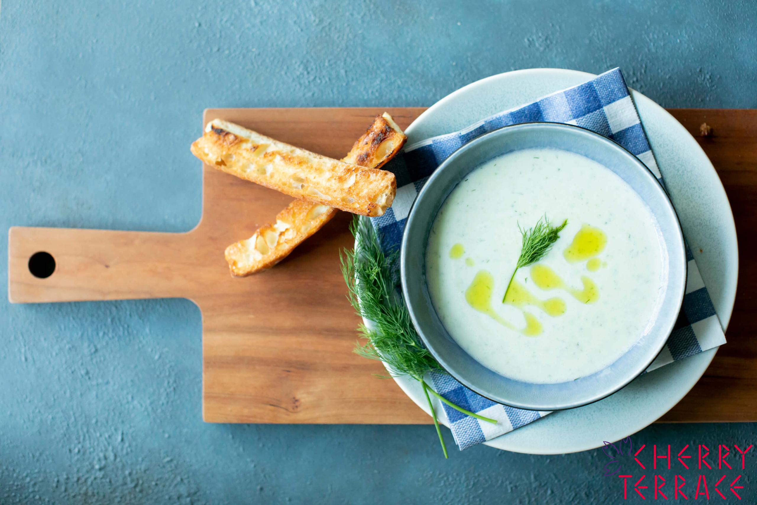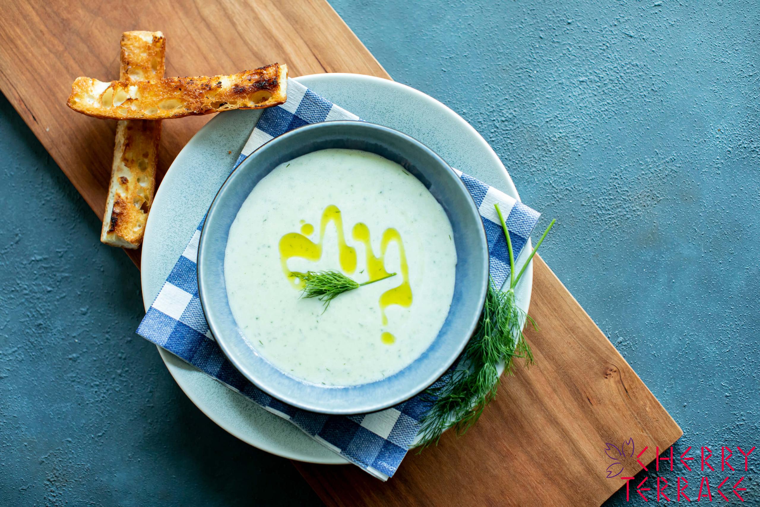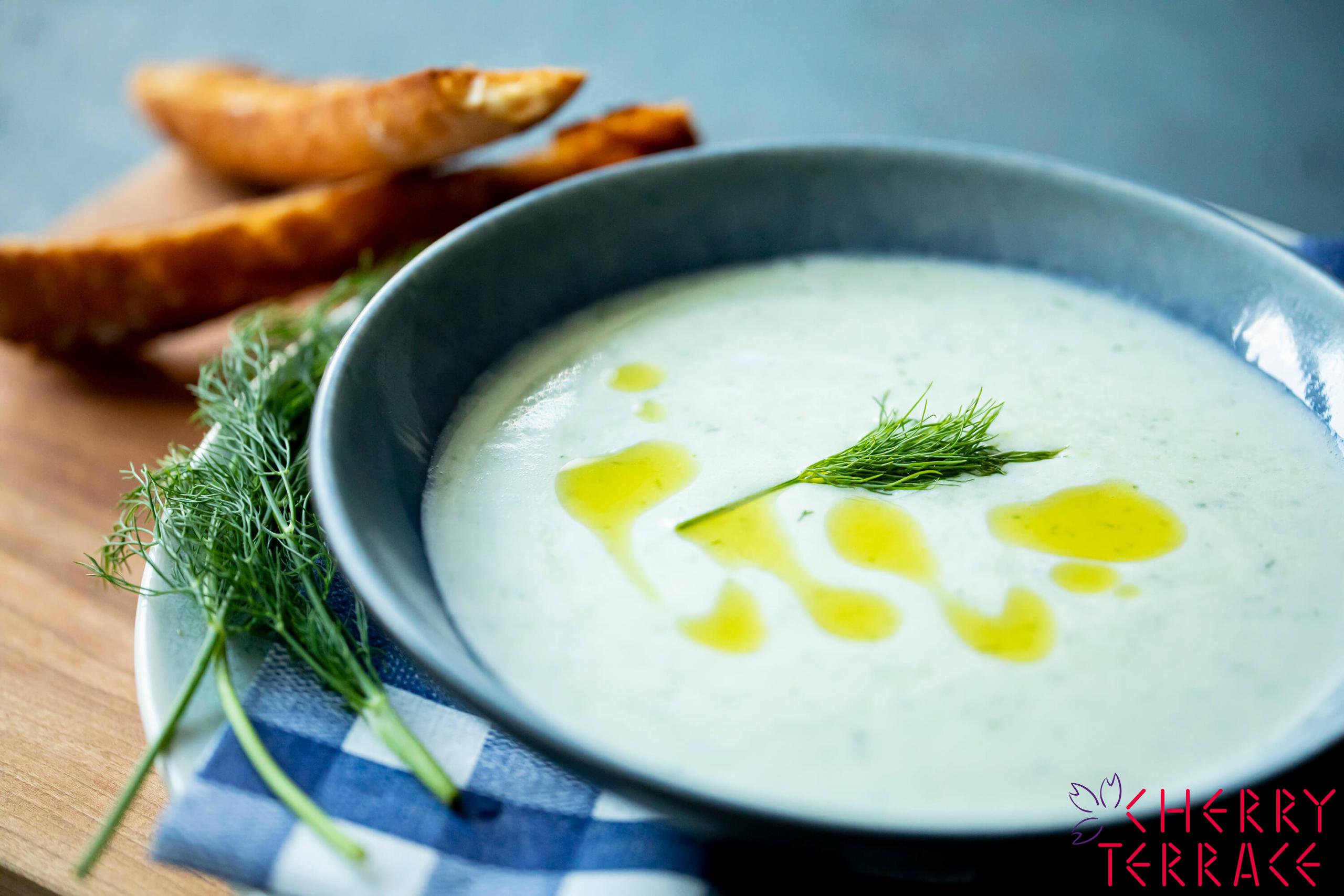 - きゅうりとディルの葉を加え、バーミックス(ミンサー)でなめらかにつぶし混ぜる。牛乳、ヨーグルトを加え、さらにバーミックス(ミンサー)で混ぜ、塩、こしょう(各少々)で味を調えて、冷蔵庫で冷やす。