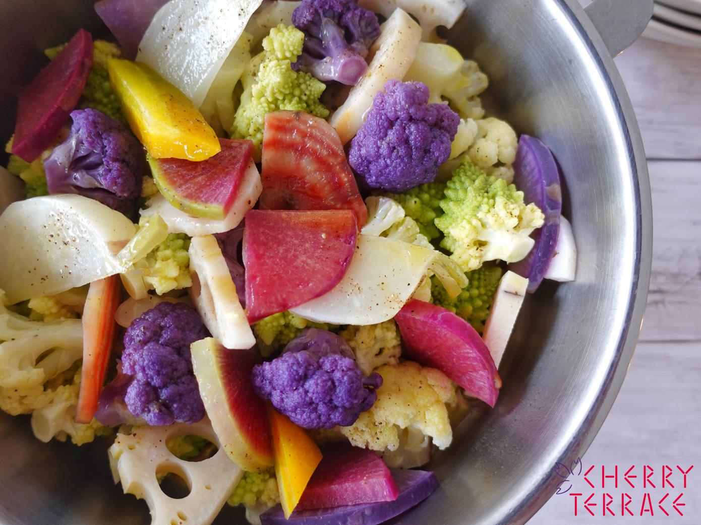 温野菜がたっぷりいただける簡単レシピ。かぶ、れんこん、カリフラワーなど、冬が旬の野菜をたっぷりのラウデミオ(EXV.オリーブオイル)で蒸し煮にします。素材の旨みが引き出され、驚くほどたくさんいただけます。