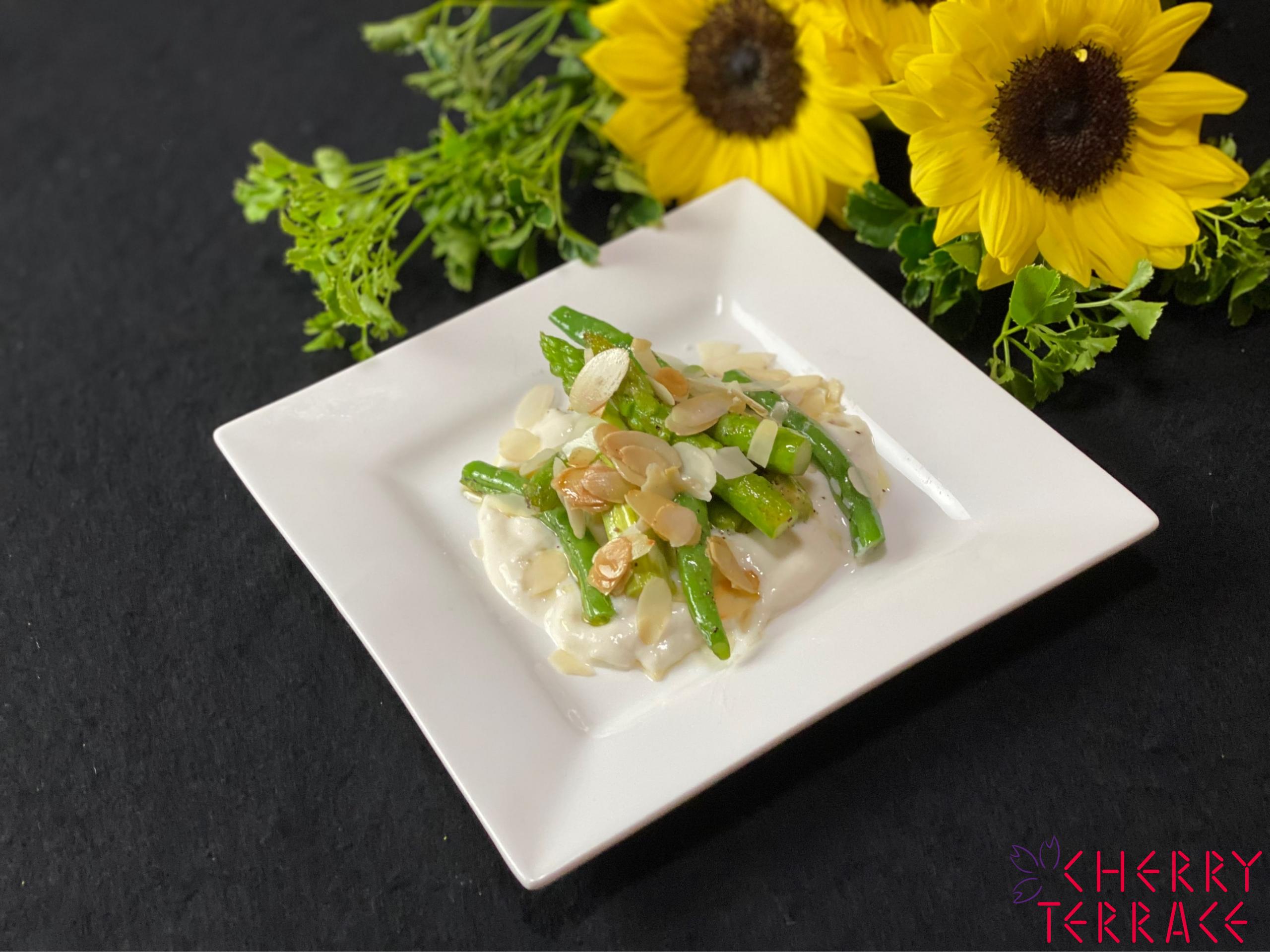 - お皿にソース、アスパラガスとインゲンを盛り付け、アーモンドスライスをかざって出来上がり。