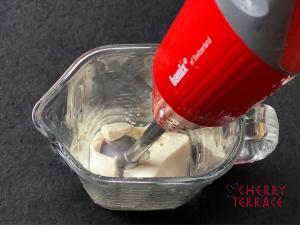 - ソースを作る。ガラスピッチャーにレモンクリームソースの材料のレモンの皮以外をすべていれてバーミックス(ミンサー)で滑らかになるまで撹拌する。味見して味が薄ければ塩を足して、最後にレモンの皮の千切りをまぜる。