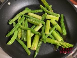 - クリステルフライパンにオリーブオイル大さじ1(分量外)を入れ、アスパラガスとインゲンを中火で炒める。軽く塩胡椒を振る。