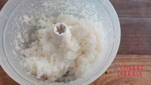 - 炊けた米をバーミックス(スライシー/チョッピングナイフ)で少し粒が残るくらいまで切り混ぜる。