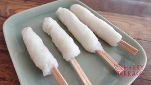 - チョッピングナイフを取り外し、中の米を4等分にし、塩水をつけた手で割り箸に均等に巻きつける。