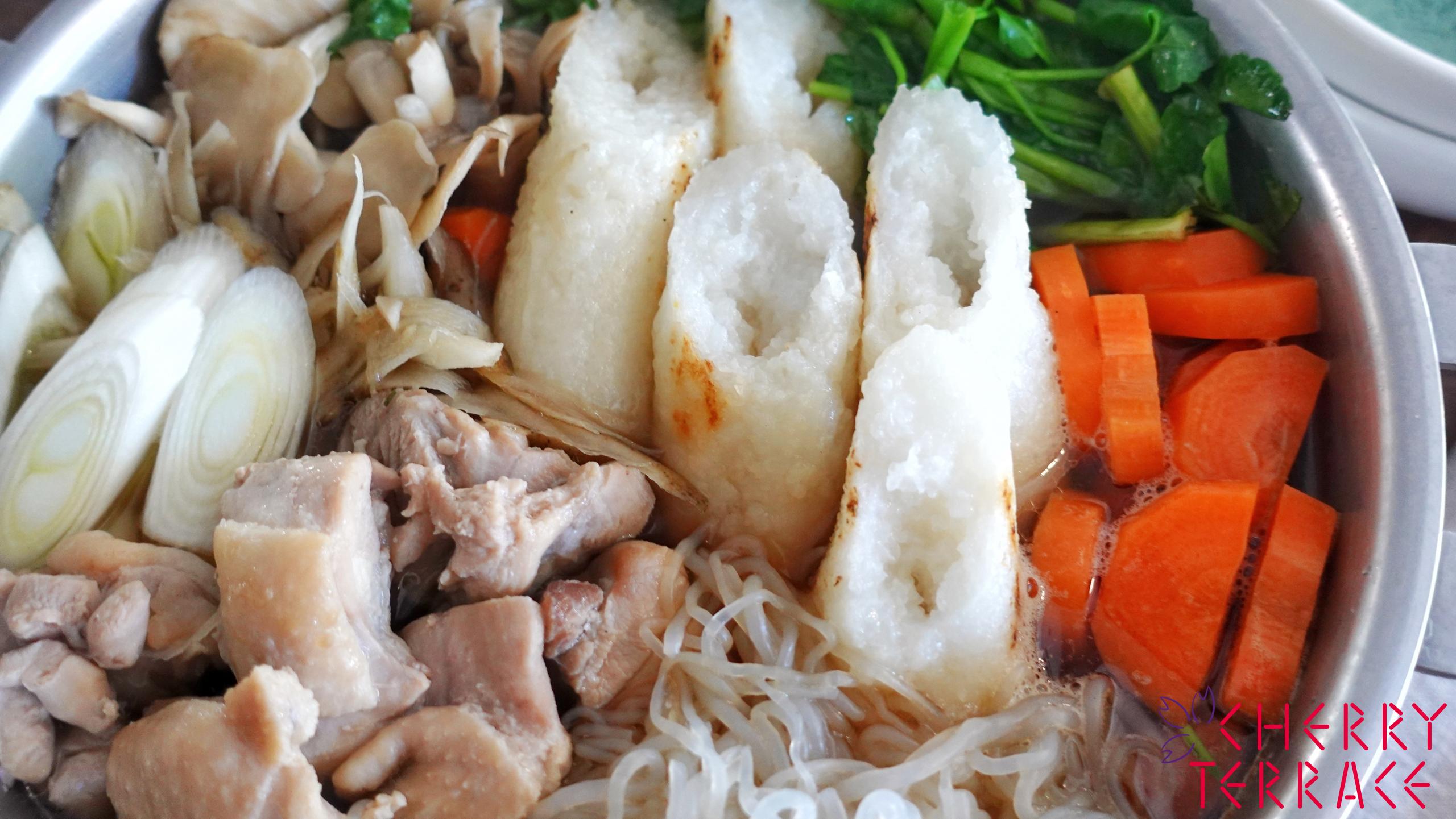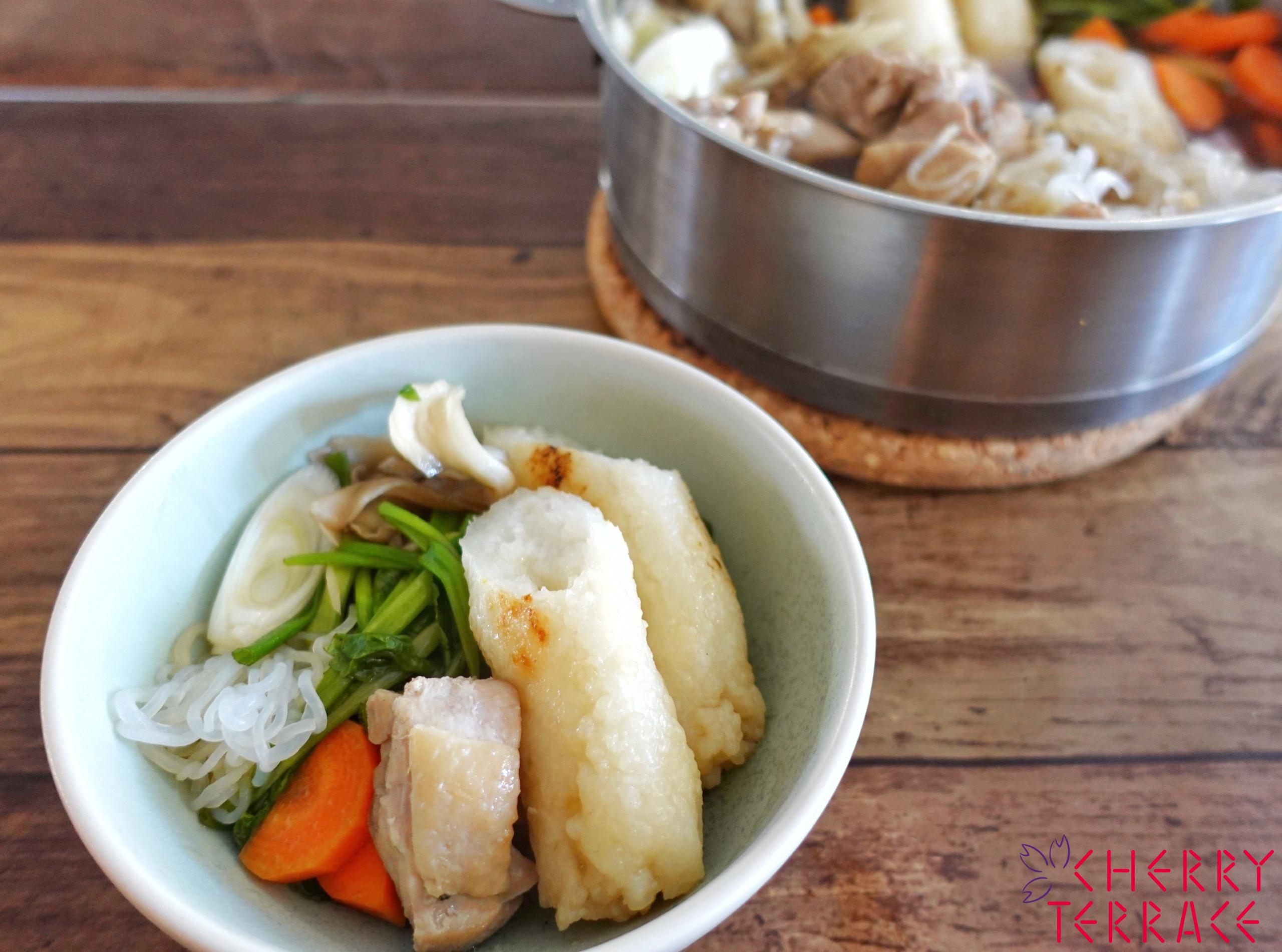 - クリステル浅鍋20cmにスープの材料を入れ。一度沸騰させる。鶏肉、にんじんを加え、火を通す。残りの材料ときりたんぽを加える。