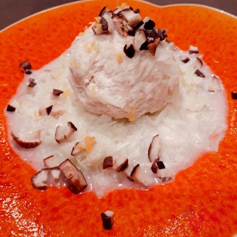 • 塩で味を調え、器にスープと鶏団子を入れ、ラウデミオを回しかけ5のしいたけと柚子の皮をちらす。