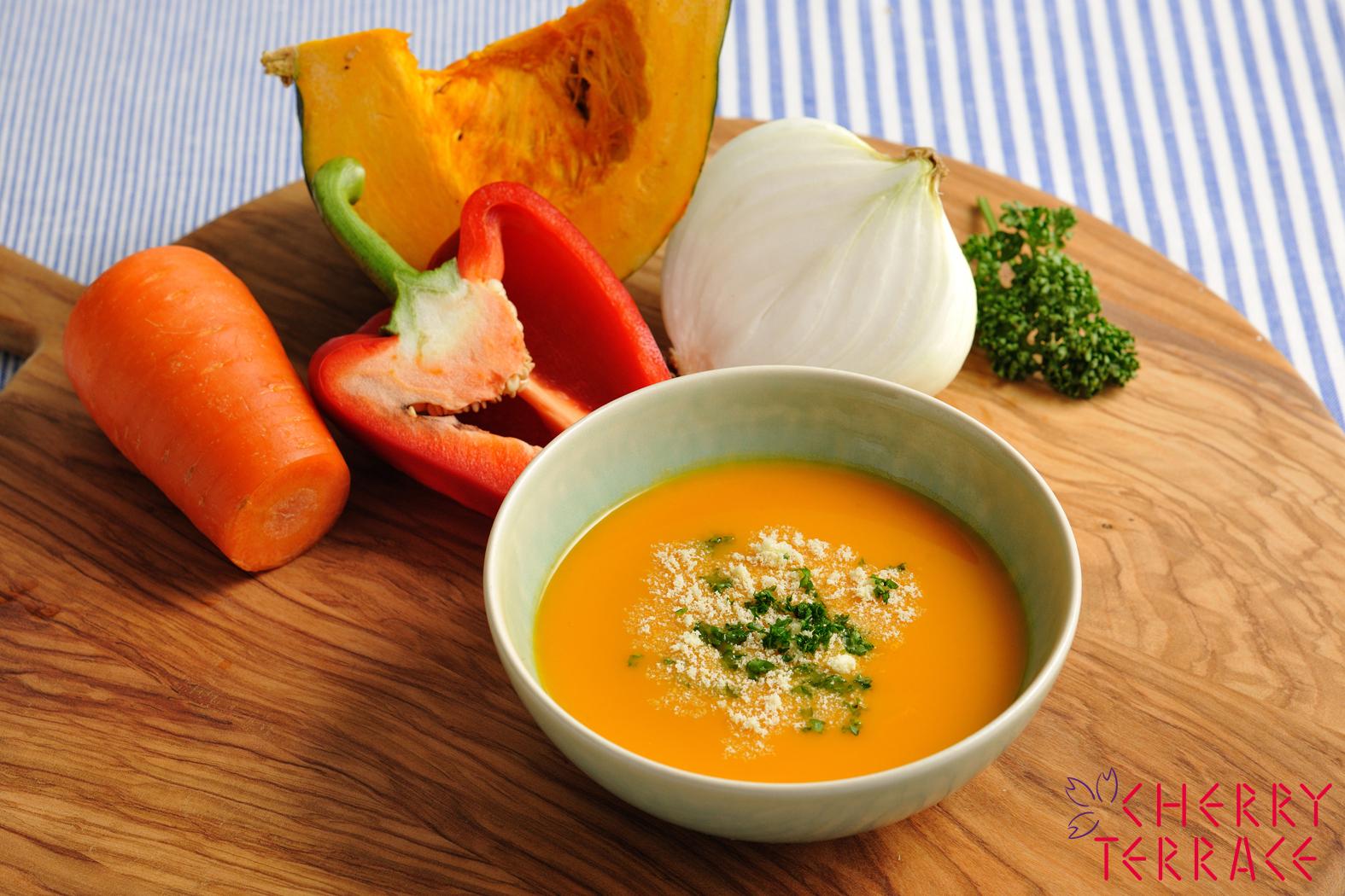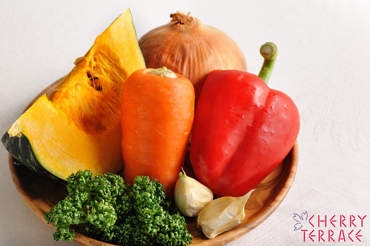 - クリステル深鍋にバターを熱し玉ねぎとにんにくを炒める。にんじん、パプリカも加え、しんなりしたらかぼちゃも加えて炒める。