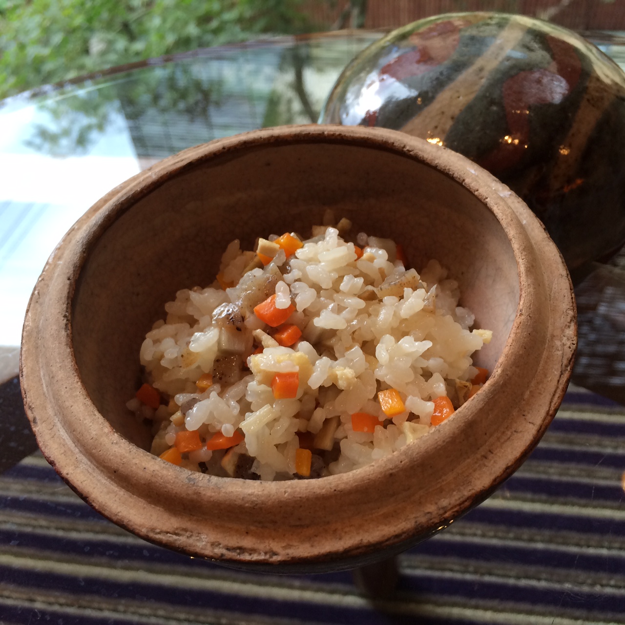 - BONPOTに米と出汁、酒、みりん、薄口しょうゆ、塩を入れて混ぜ、1、2をのせる。