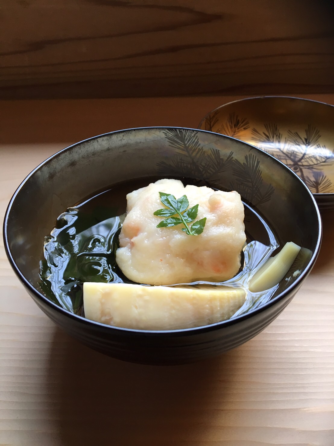 - お椀に3の海老しんじょうを盛り、その手前に筍を盛る。塩少量で味を調えた熱い吸地をはり、木の芽を添える。