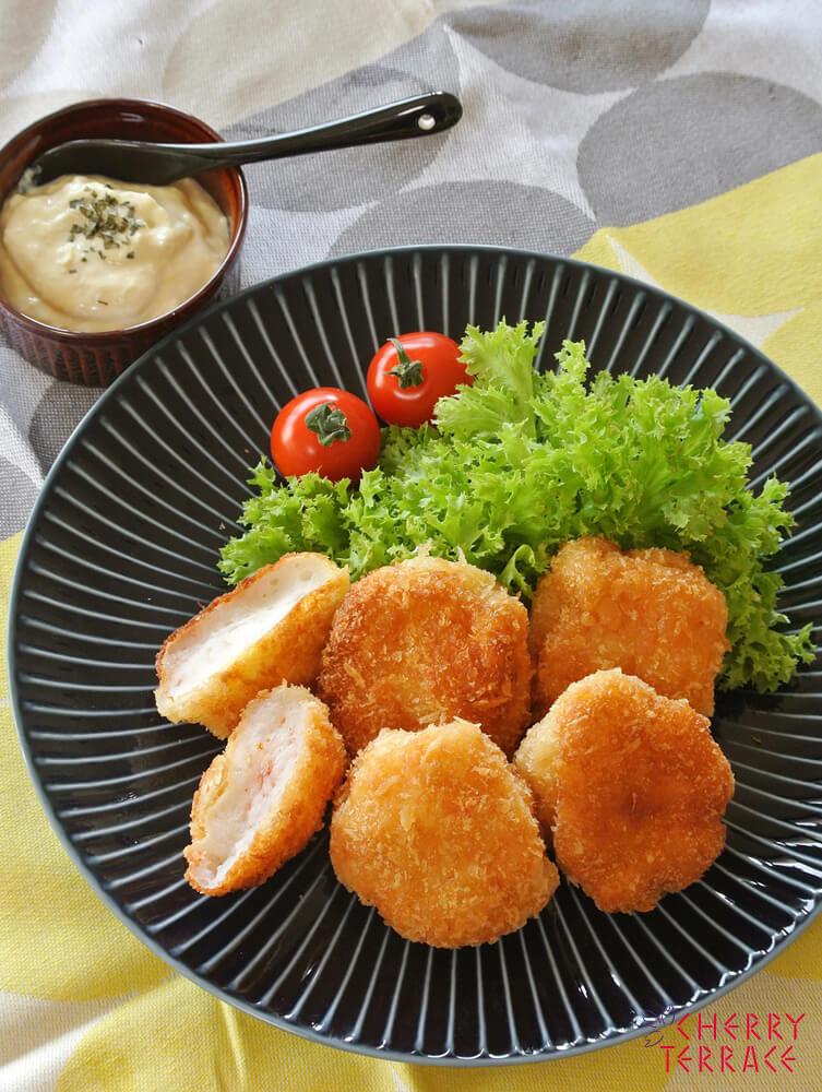 • 2を8等分の俵型に成形し、小麦粉、卵、パン粉の順にまぶしておく。
