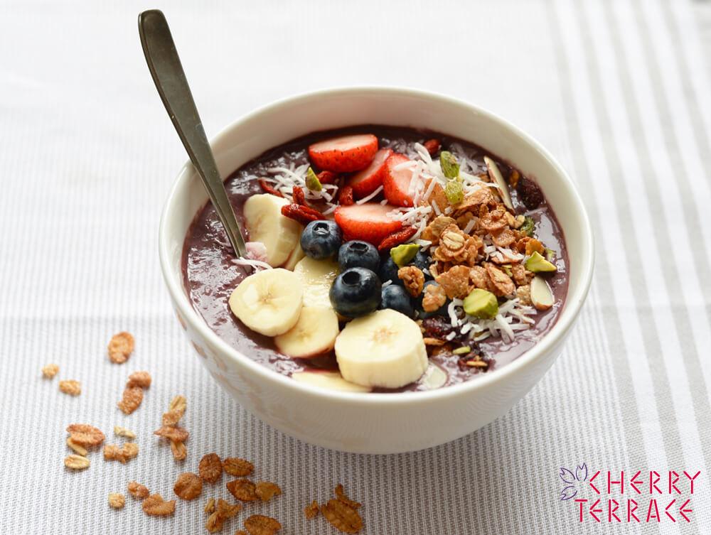 スーパーフードと言われるほど栄養価の高いアサイーのスムージー。冷凍庫にフルーツを常備しておくとバーミックスであっという間に出来上がります。ミックスベリーを加えてトッピング無しでも美味しいレシピです。