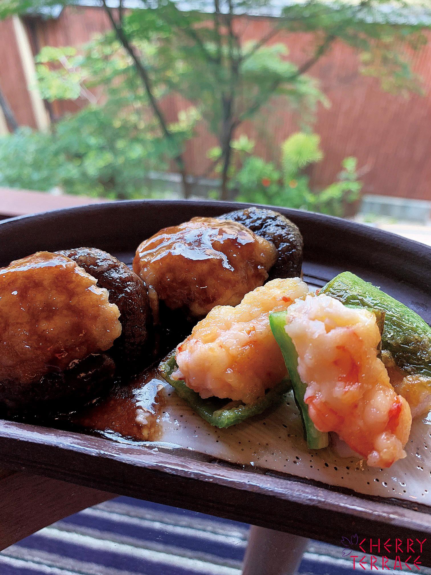 肉厚で独特の甘みが美味しい京都の伝統野菜 万願寺とうがらしに海老ミンチを詰め、椎茸には鶏のそぼろを詰めた、お酒のお供にもお弁当にも喜ばれる一品です。オーブンで焼くことで、形が崩れることなく美しく、お味もジューシーに仕上がります。椎茸のそぼろ詰めにはバルサモ・ディヴィーノがよく合います。