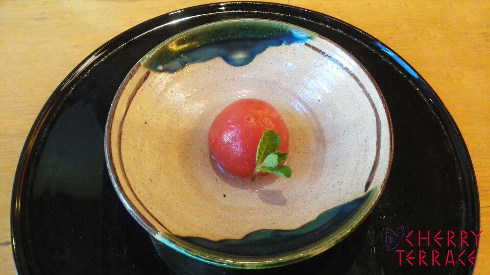 - クリステル深鍋に水を沸騰させてからグラニュー糖を加え、1のトマトをゆっくりと落とし入れてから火加減を弱火にしてゴトゴトしないように7分ほど炊く。