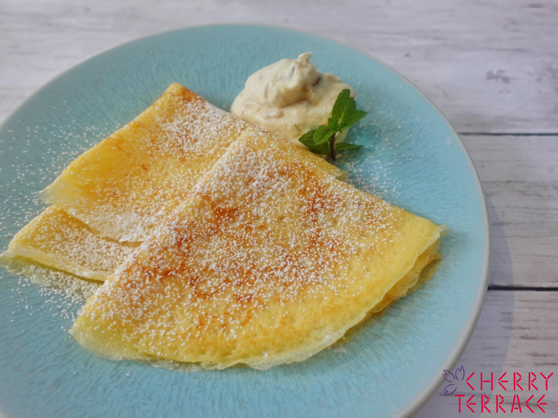 - クリステルフライパンを熱してバター(分量外)を薄くひき、2をおたま1杯ほど入れ、フライパンをゆすって広げ、表面が乾いてきたら静かに裏返す。全体に薄く焼き色がついたら取り出して重ねておく。
