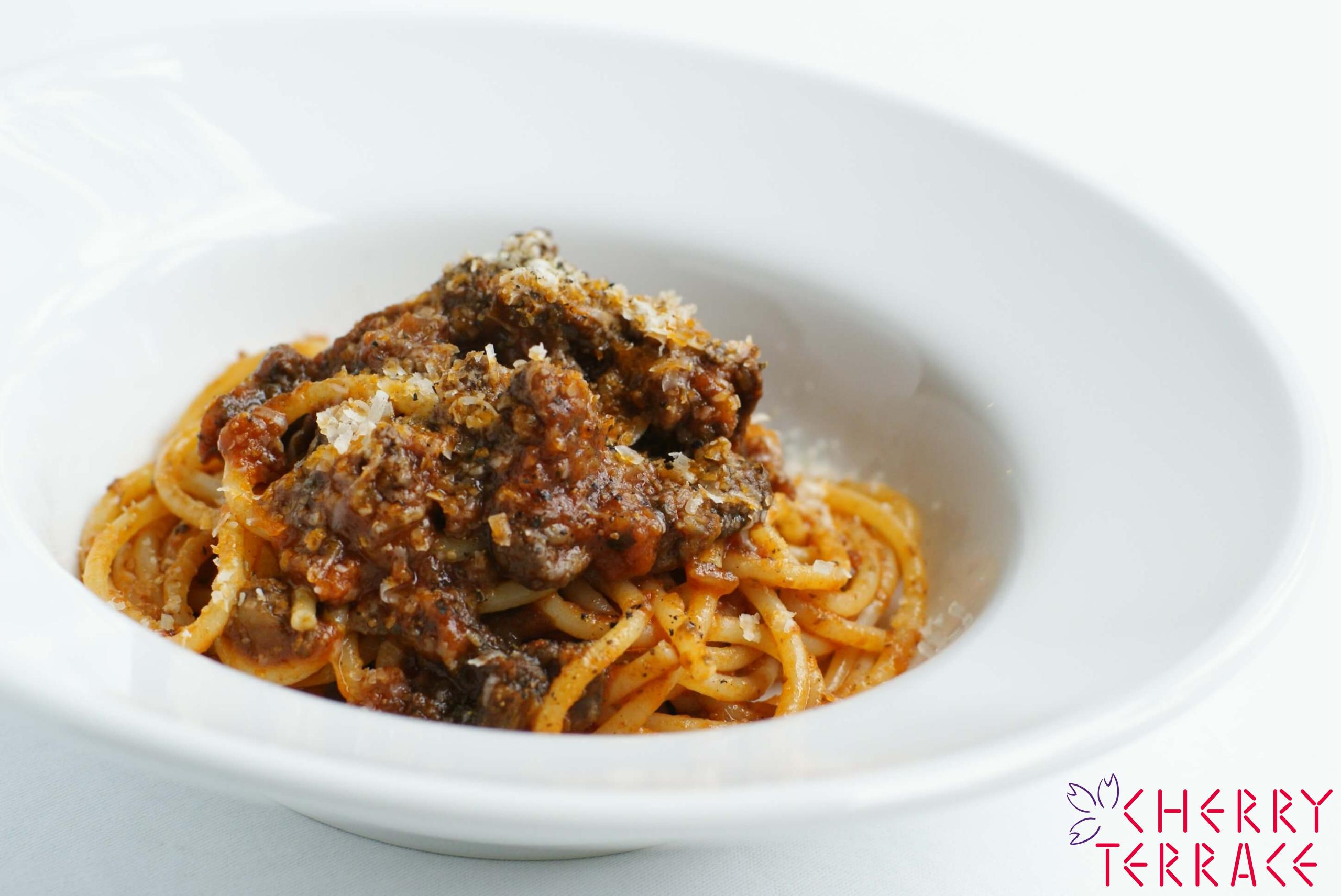 - パスタを茹で、ボロネーゼを和え、パルミジャーノ、黒こしょうをふり、仕上げる。