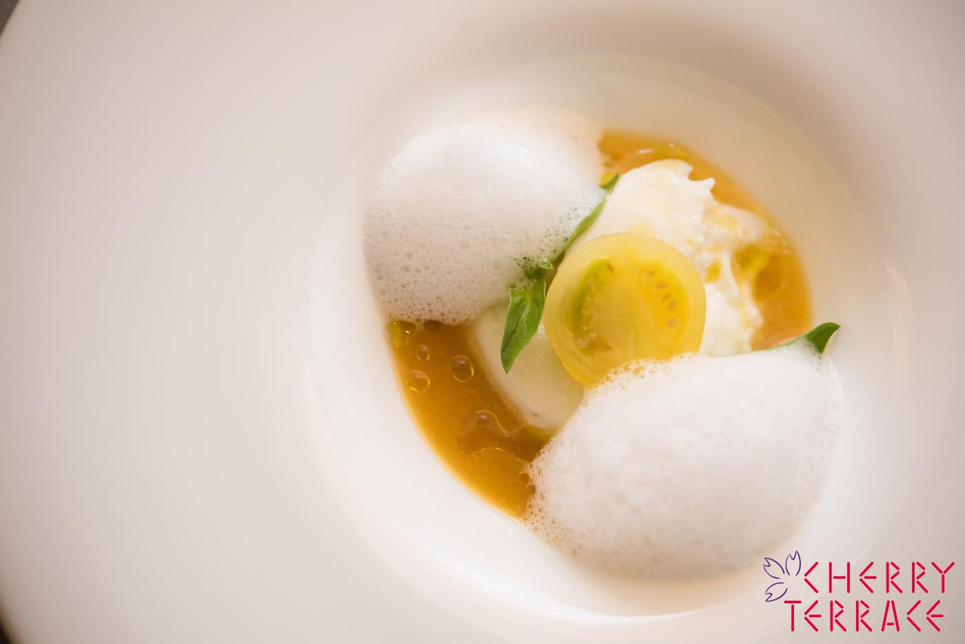 黄色いトマトのスープに、トマトの透明なジュの泡と、きゅうりのジュのアイス、モッツアレラを添えて。トマトのおいしさを堪能できるスープです。