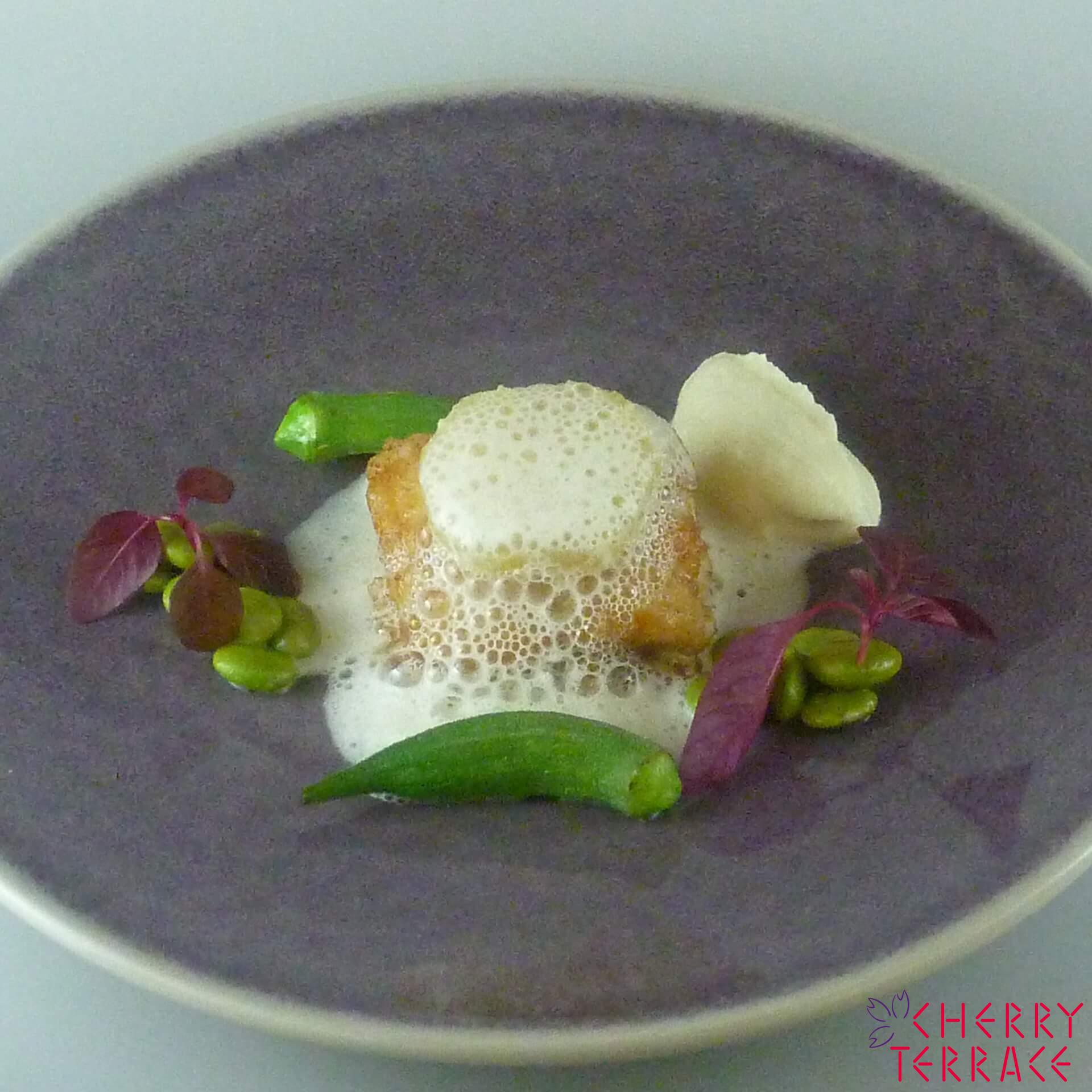 盛り付ける。皿の真ん中にカレイを置き、カリフラワーのピュレ、付け合わせの野菜を周りに置きアマランサスを飾る。カレイの上にレモンをのせ、その上から泡立てたソースをかける。好みで、レモンを絞って供する。