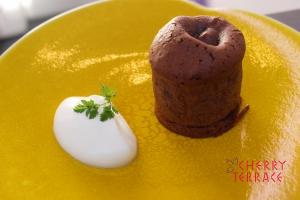 - 栗をシロップから引き上げ、よく水気をきってコンスターチをまぶす。200度に熱したサラダ油で2分〜3分からっと揚げる。揚げた栗に粉糖を振り、チョコレートのスープと共に盛り付ける。※1