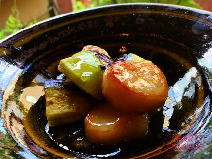 • 器に賀茂茄子と帆立貝を盛り付け、3の琥珀あんをかける。