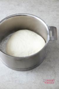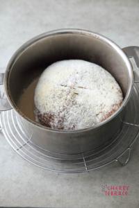 • クリステル深鍋14cmに多めに粉をふり、丸めた生地を移す。蓋をして1時間発酵させる。