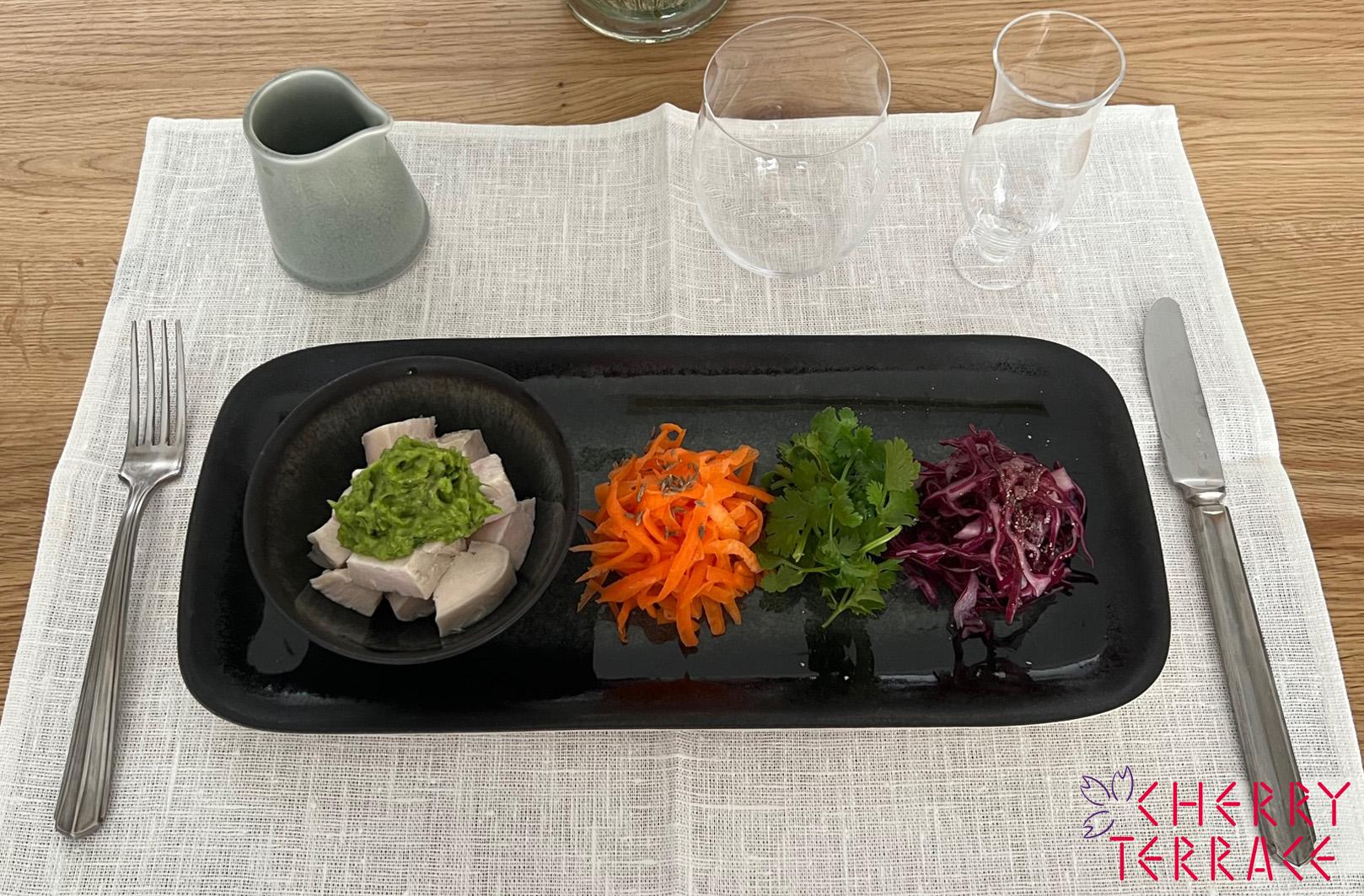 - バット等に、肉、香味野菜、蒸し汁を移し、ラップをしっかりかけ冷ます。