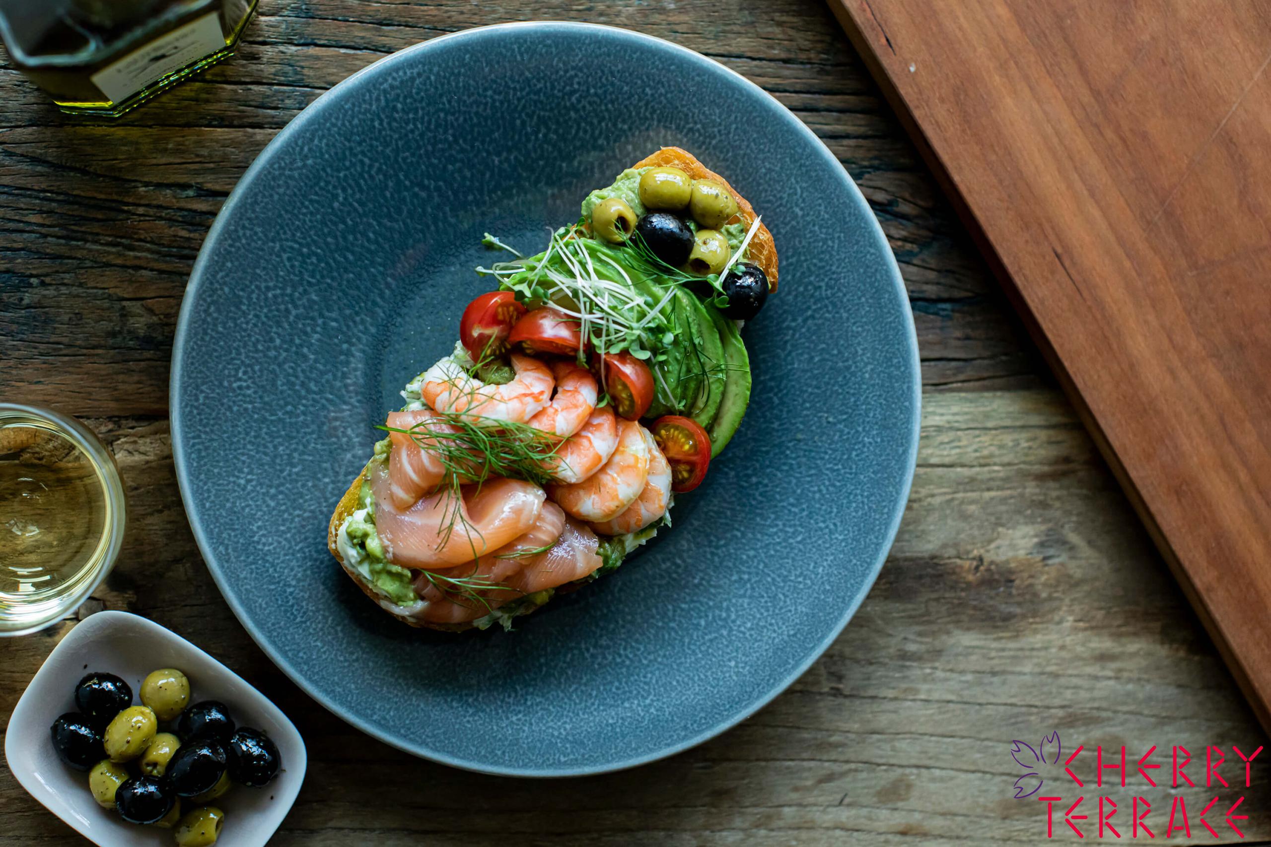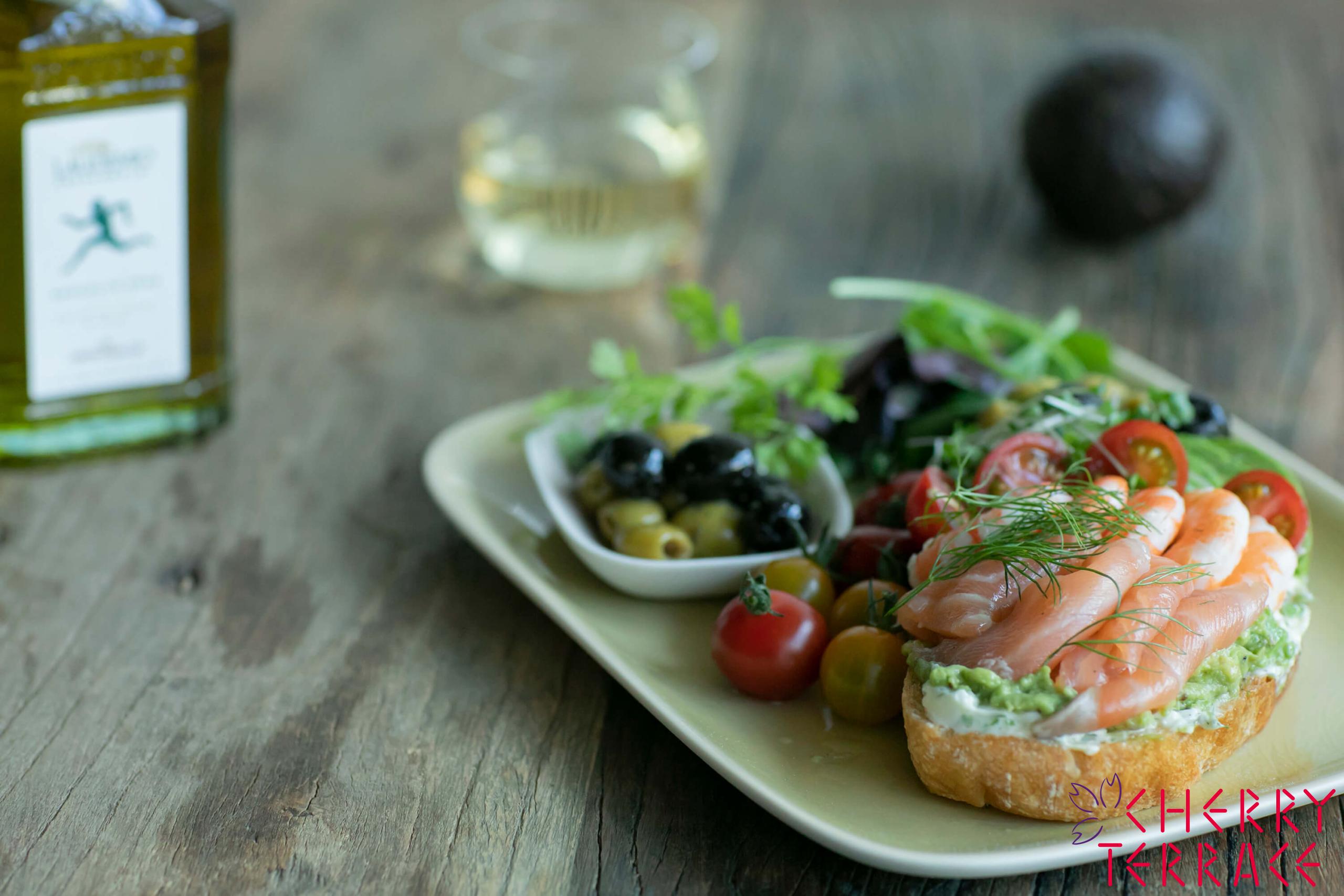 - 焼いたカンパーニュにハーブバターを塗り、アボカドのディップをのせ、スモークサーモン、えび、アボカドを彩りよく盛り、オリーブ、スプラウト、ディルの葉を飾る。もう一人分も同様に作り、プチトマト、オリーブ、ベビーリーフを添える。