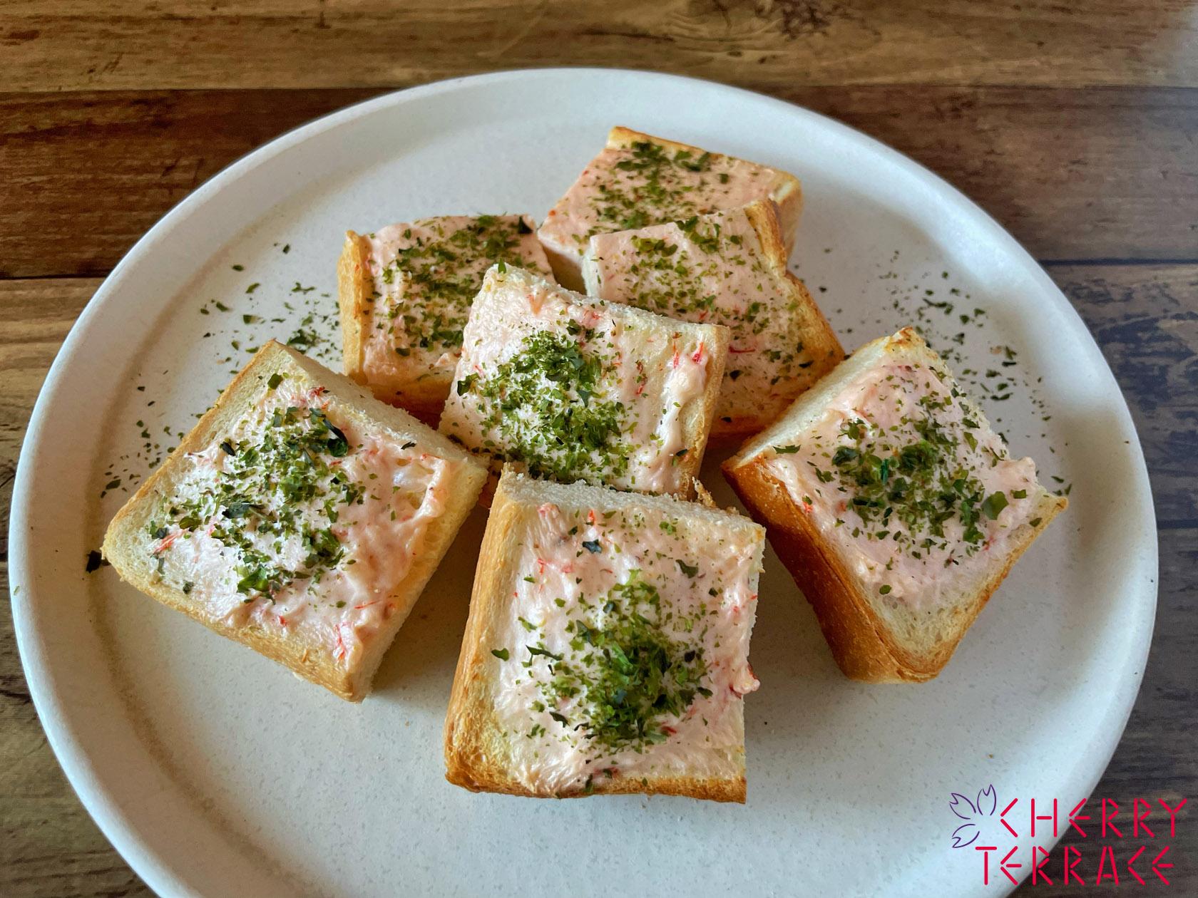 - 食パンの片面に1をぬりつけ、青のり、けしの実をふりかける。