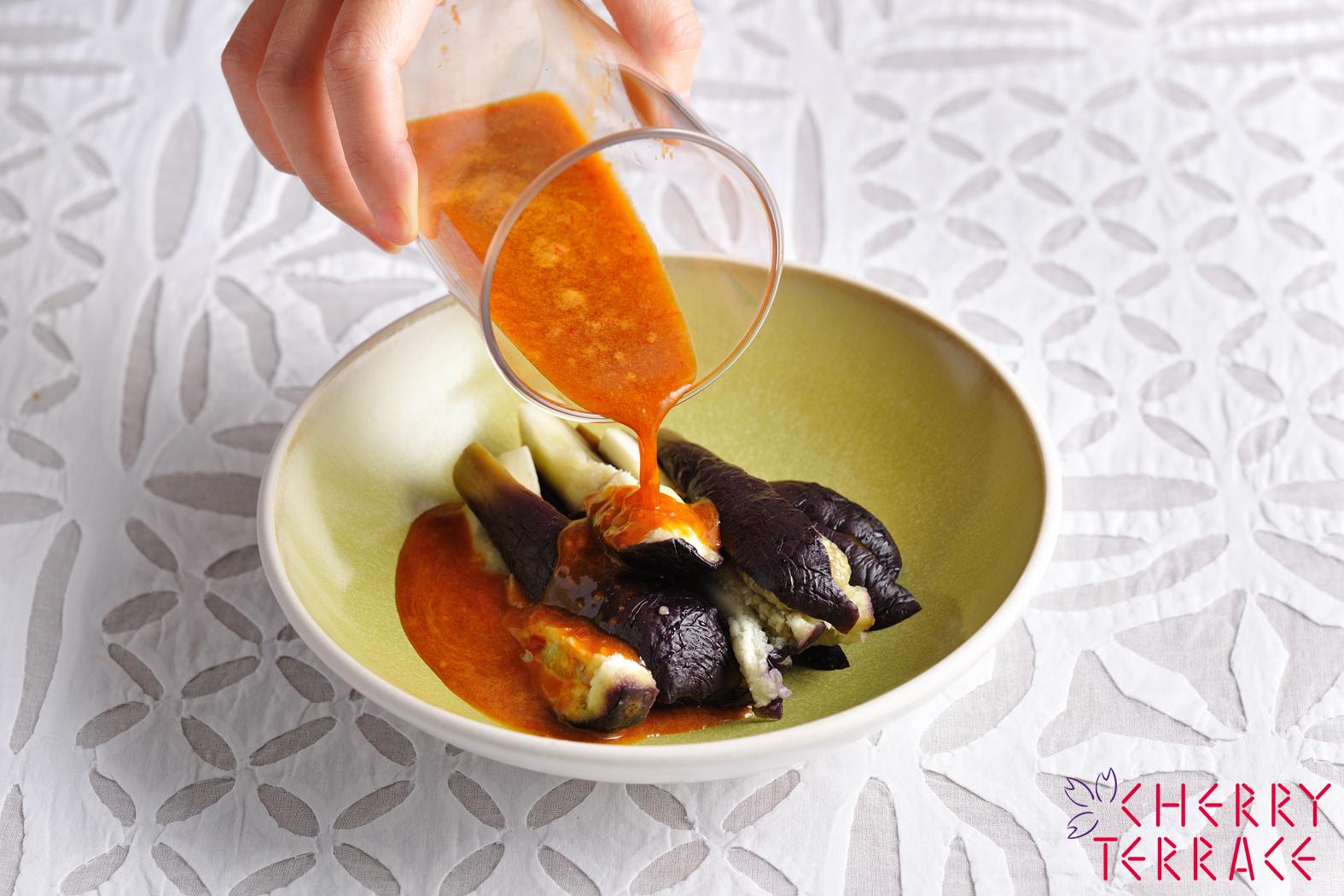 蒸しなすをよく冷やし、豆板醤やにんにくの入ったピリ辛のたれで和えて。暑い日にも食欲の増す一品です。