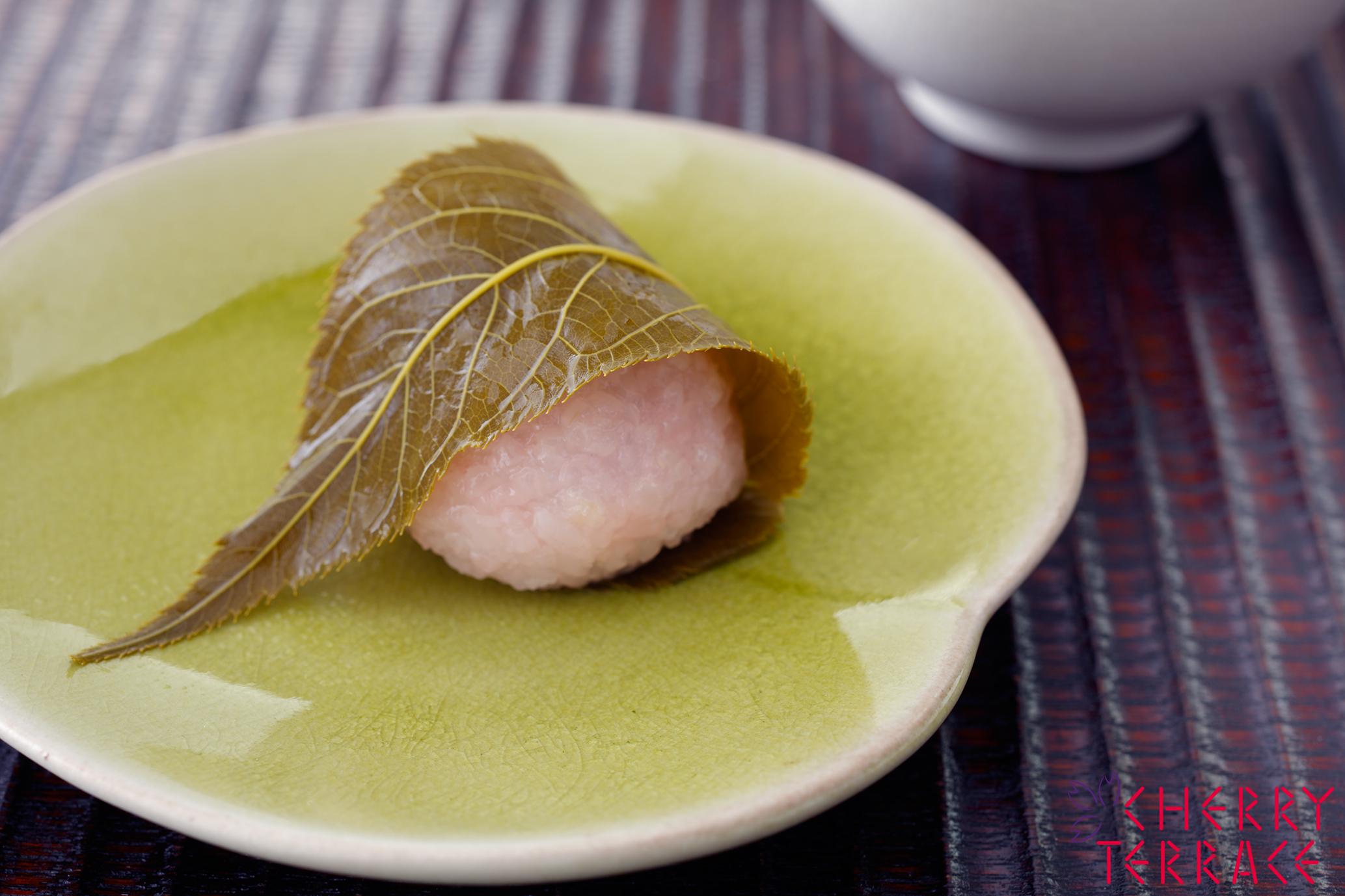 - 手水をつけ6の種を手のひらで7cmほど広げ、用意したあんをひとつのせ、手のひらで包み込むようにしてあんを包む。手のひらで丸め、桜の葉で包む。