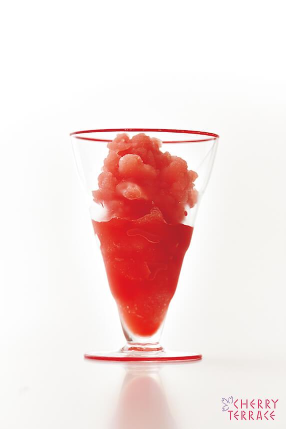 - 冷凍したスイカをバーミックス(ミンサー)でつぶし混ぜてシャーベット状にする。