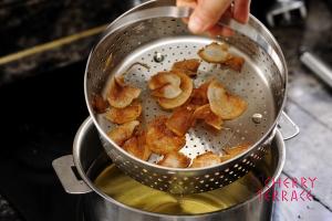 - 揚げたてに塩をふる。しっかり水気をふき、クリステル深鍋にクッキングバスケットをセットし、170℃〜180℃の油で揚げる。揚げたてに塩をふる。