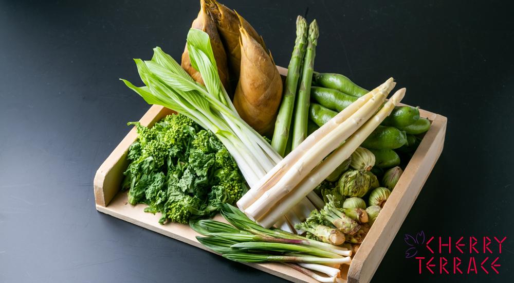 彩りあざやかな「春野菜のスパゲッティ」は、春野菜特有の苦みやうま味をたっぷり味わうことのできる一品です。辛子和えや土佐煮など、和風の味付けでいただく事の多い菜の花や筍ですが、洋風の料理にも非常に相性の良い食材です。