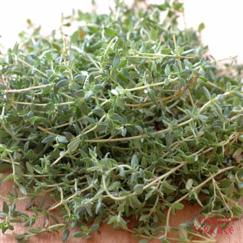 シソ科。地中海原産。和名を立麝香草(たちじゃこうそう)、木立百里香(きだちひゃくりこう)というポピュラーな香辛野菜。生よりも、開花初期に花をつけた茎を葉ごと切り取って陰干しし、乾燥葉をそのままか粉末にした香辛料(スパイス)として使うのが一般的。さわやかで強い香りとほろ苦さがあり、長時間加熱しても香りが持続するので、肉や魚のくさみ消しに適し、ハム、ソーセージ、ピクルスといった加工食品に用いられる。料理では、魚のムニエル、クリーム煮、クラムチャウダー、シチューなどからハーブバター、ハーブオイル、ハーブビネガーなどに使われる。ただし、料理に使うときは使いすぎると風味を損なうこともあるので、使いすぎないようにすること。 ◇栄養成分 精油の主成分はチモールやカルバクロールで、食品の保存や消臭に効果がある。