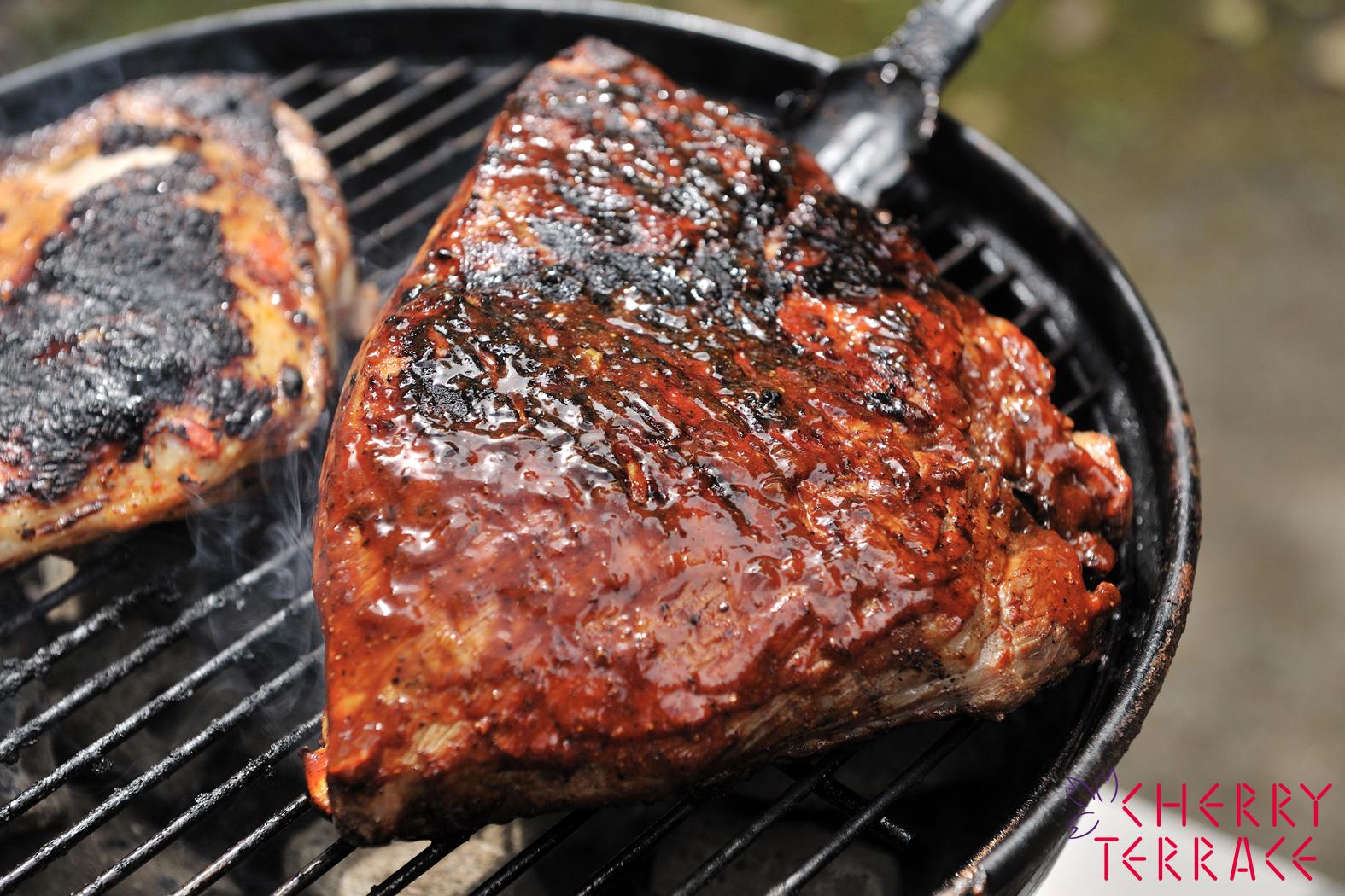 - グリルなどで焼く。途中でBBQソースを塗りながら焼く。