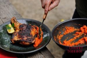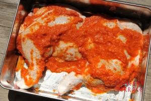 スペイン風のつけ込みダレ。パプリカがメインのソースなので、スパイスが効いていて食欲をそそります。骨付きの鶏もも肉のほか、手羽などもおすすめです。