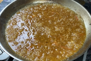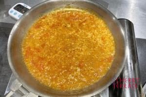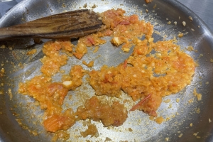 - 同じフライパンにラウデミオをひき、にんにく、玉ねぎのみじん切りを炒める。トマトを加え、水分が完全になくなるまで炒める