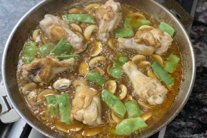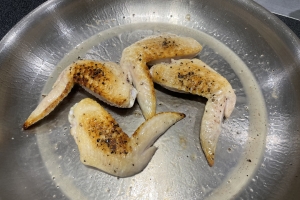 - 十分に熱したクリステルステンレスフライパン28cmにラウデミオをひき鶏手羽を焼き、十分な焼き色が付いて火がある程度通ったら取り出す。同じフライパンにラウデミオを足し、きのこを炒めて取り出す。